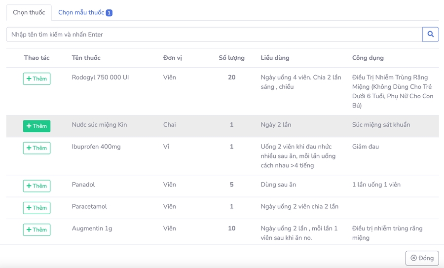 Tại đây, chọn '' thêm thuốc'' và click '' thêm'' để chọn đơn thuốc phù hợp cho khách hàng