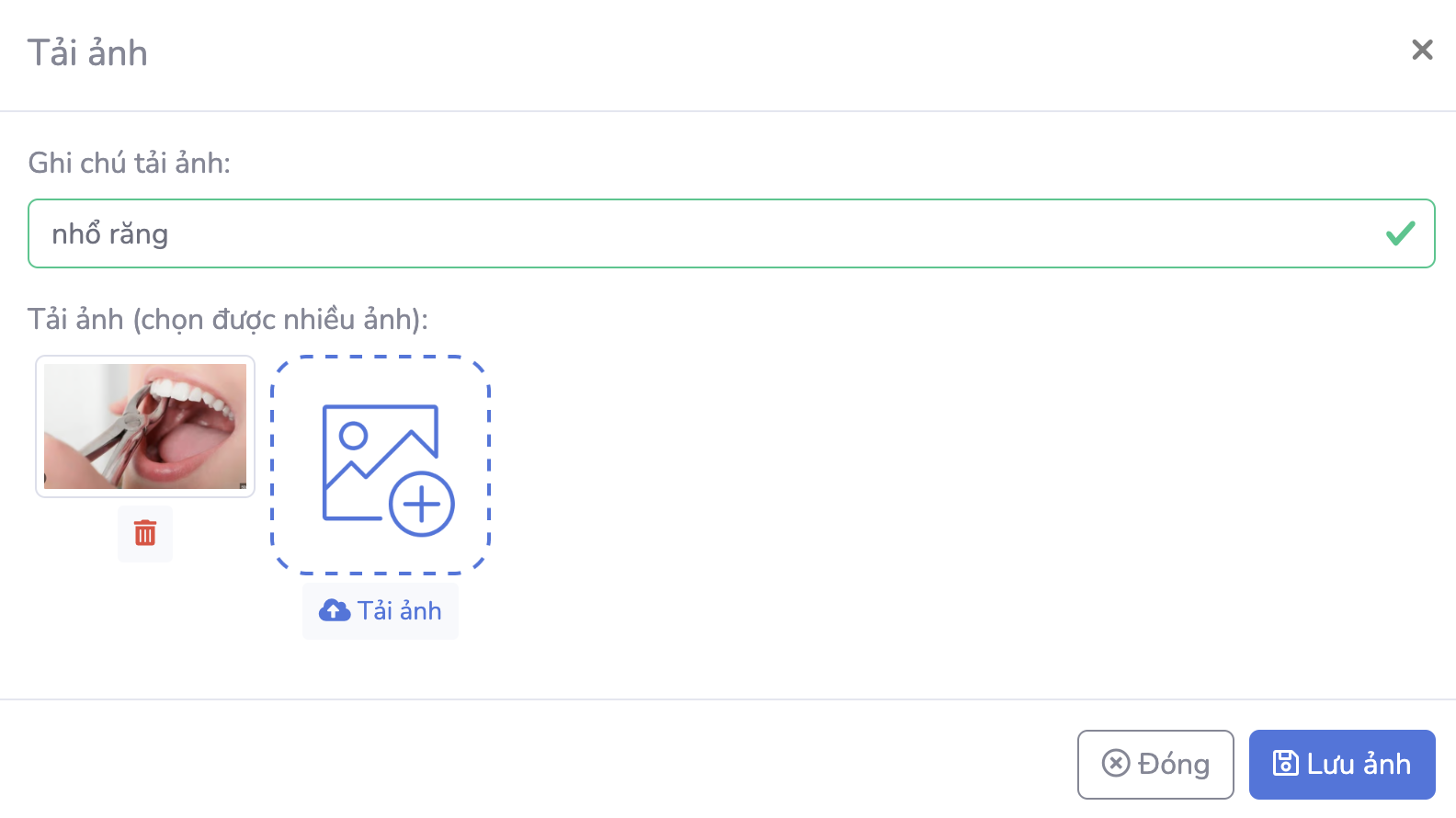 Nhập ghi chú tải ảnh và click '' tải ảnh '' để thêm ảnh điều trị